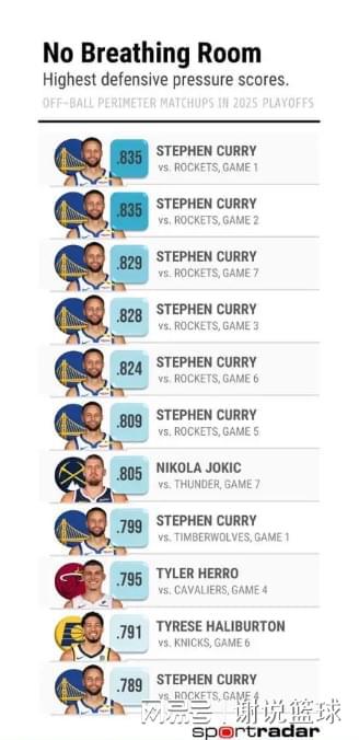 博主进行了详细解释,这个数据的统计方式,主要考虑到在无球状态下,对手给予的防守压力强度。斯蒂芬-库里十分夸张,他包揽了榜单前六名,与森林狼伤退的比赛,同样排在第八的位置。哪怕首轮G4表现相对一般,但系数依然在0.789左右,排名榜单第11位,换言之斯蒂芬-库里表现相对一般的时候,进攻端可能都比联盟9成以上球员更犀利。